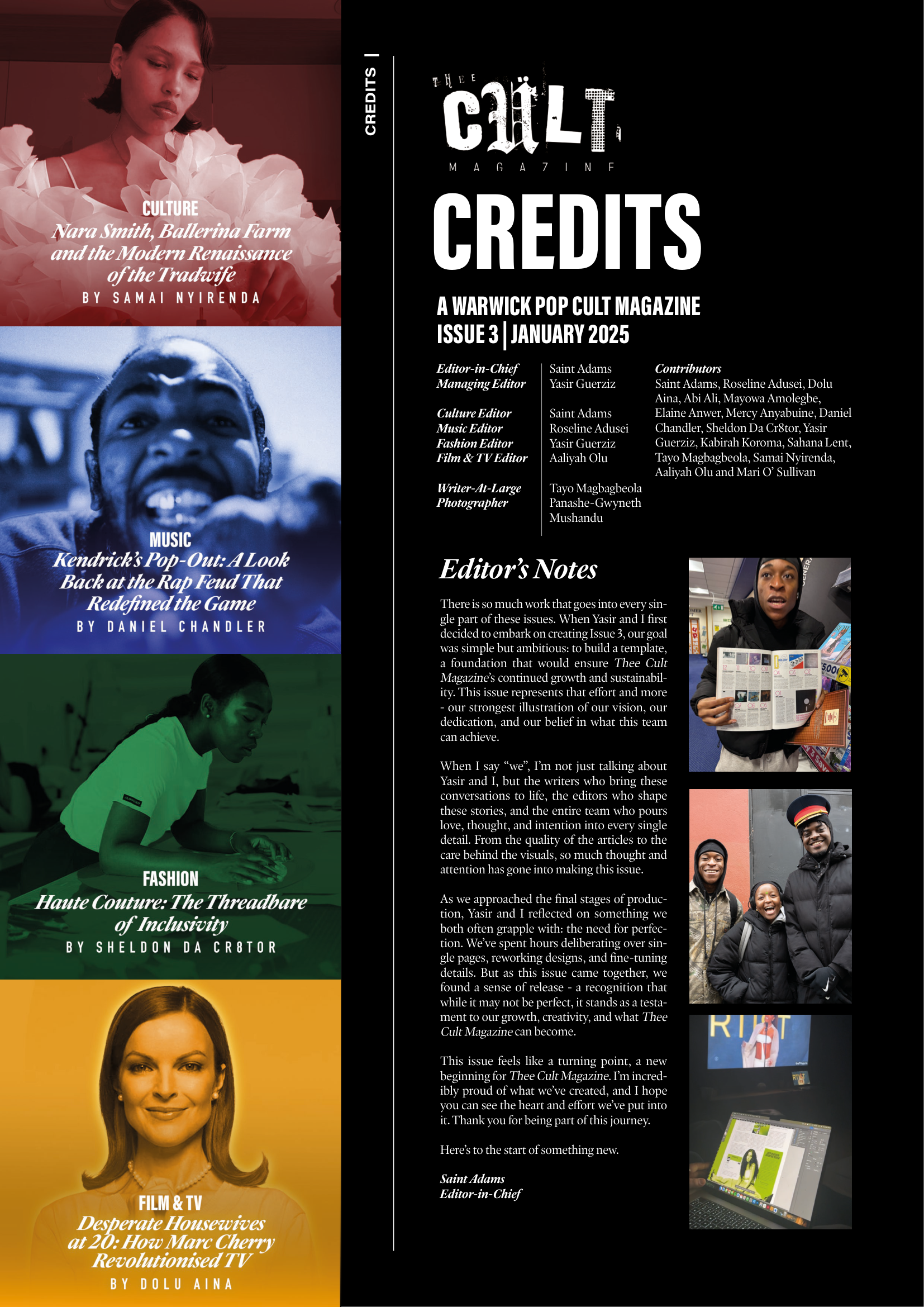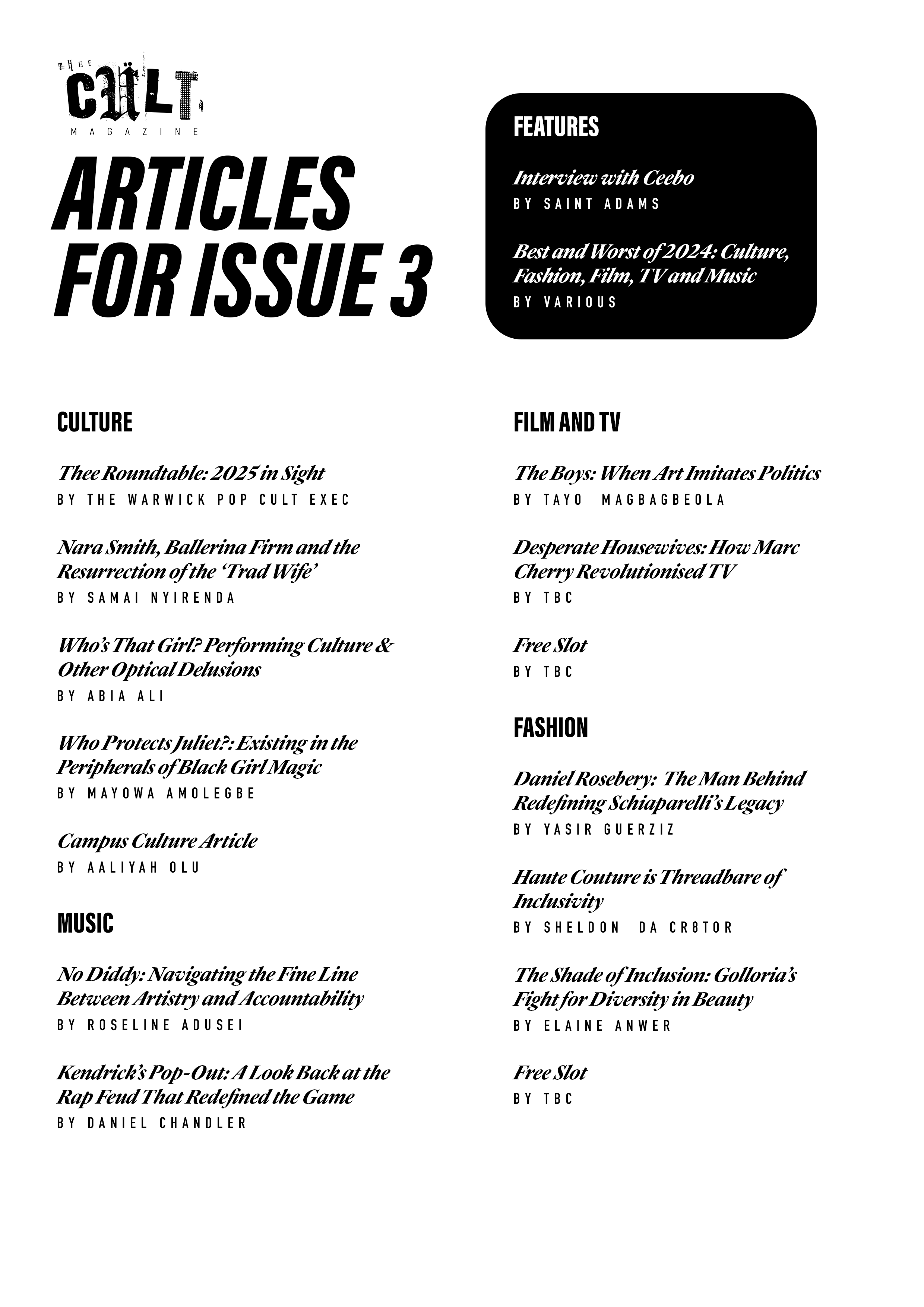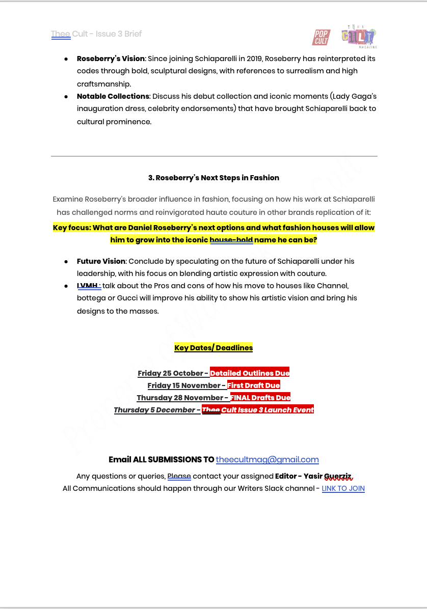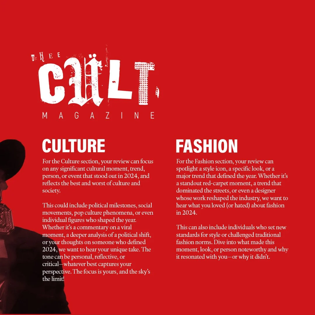 For Issue 3 of Thee Cult Magazine, I led the project as Editor-in-Chief and Creative Director, overseeing the publication’s structural redesign, editorial refinement, visual identity evolution and full-scale production. This issue marked the transition from experimental student magazine to a deliberately structured editorial platform, with formalised sections, a defined cover feature and a strengthened internal review process. My role spanned commissioning and editing writers, redesigning the logo, directing photography and executing the complete layout in InDesign. Issue 3 represents the consolidation of creative ambition into systems - transforming Thee Cult from a growing project into a disciplined publication.Issue 3 marked a defining shift for Thee Cult Magazine, as it established a distinct identity separate from Pop Cult and formalised the publication as a scalable editorial platform. Built around a "2024 in Review" theme - a revisited failed concept from 2024's The Contributors' Issue - the issue focused on refining both visual identity and internal structure. Central to this shift was a redesign of the magazine’s visual language, beginning with the logo. Rather than abandoning the scrapbook aesthetic established in earlier issues, we simplified and abstracted it into a more controlled, adaptable form.This shift was directly tied to the decision to launch a dedicated social media presence for Thee Cult. Previously, the magazine had been promoted through the Warwick Pop Cult account, but Issue 3 marked the point at which it began to operate as a distinct entity with its own platform and visual identity. The redesigned logo and simplified system allowed the brand to translate effectively across this new context, supporting a more cohesive and recognisable rollout.As Editor-in-Chief and Creative Director, I oversaw the expansion of the magazine’s sectional structure across culture, music, fashion, and film & TV, managing section editors while also operating directly as Culture Editor. I led the development of editorial direction by defining pitch briefs, often building them into fully realised concepts before guiding contributors through a structured editorial process that included written feedback and, where possible, live editing sessions.Alongside the development of a distinct visual identity, Issue 3 was supported by a more intentional social media rollout, which functioned not only as a promotional tool but as part of the magazine’s editorial workflow. With the launch of a dedicated Thee Cult platform, social media became a primary space for communicating briefs, promoting calls for submissions, and maintaining momentum across the production cycle.The assets, designed in Adobe Photoshop, were built to align with the updated visual system - balancing consistency with enough flexibility to accommodate different types of content, from contributor call-outs to feature highlights and section-specific posts. These visuals were used to guide contributors through the process, reinforce deadlines, and establish a recognisable presence as the magazine expanded beyond its original context within Warwick Pop Cult.A major development in Issue 3 was the transition into Adobe InDesign, marking a shift toward more professionalised layout and production processes. Alongside Yasir Guerziz, I began learning InDesign from scratch in the months leading up to the issue (October - December 2025), translating our existing Photoshop-based approach into the more structured editorial workflow of InDesign. This period was not only about learning a new software, but about understanding how InDesign could support the construction of a scalable design system. While writing was still being commissioned and developed, we used this time to experiment with layouts, master pages, and typographic structures - establishing a foundation that could later be adapted once final content was delivered. Through working in InDesign, we defined core elements of the magazine’s visual identity, including a clear typographic hierarchy, consistent grid systems, and a simplified approach to section-based design. These decisions allowed the magazine to move toward a more cohesive and recognisable visual language, while still retaining flexibility across different articles and formats.Importantly, this phase also strengthened our confidence as designers. By building and applying these systems directly within InDesign across both editorial and promotional outputs, the visual language of Thee Cult became something we could actively operate within - akin to becoming fluent in a language. This shift extended beyond layout into creative direction more broadly. Establishing a consistent visual language allowed for greater control over how the magazine was perceived and experienced across every touchpoint, from page design to social media and aesthetic tone. As Creative Director, this meant moving from making individual design decisions to shaping a cohesive world - where typography, layout, imagery and tone all worked together to support a unified editorial identity. Through this process, design became a framework for decision making across the publication. Rather than responding to content on a case-by-case basis, the established system provided clarity on how different elements should be treated, allowing the magazine to operate with greater intention, consistency and authority.