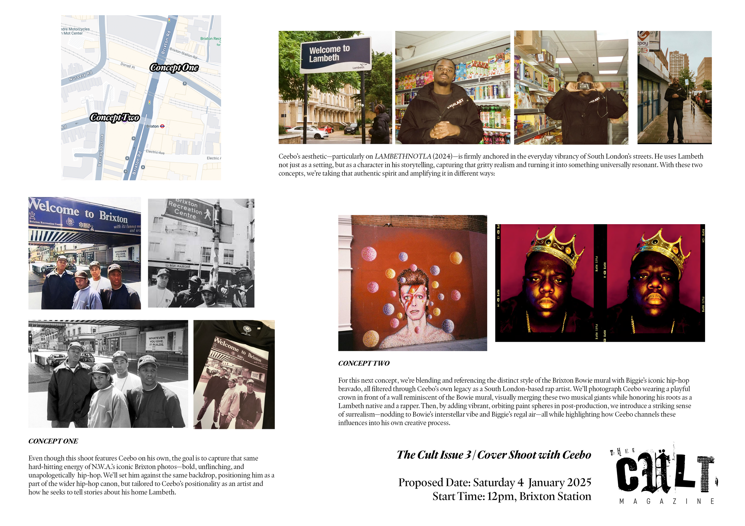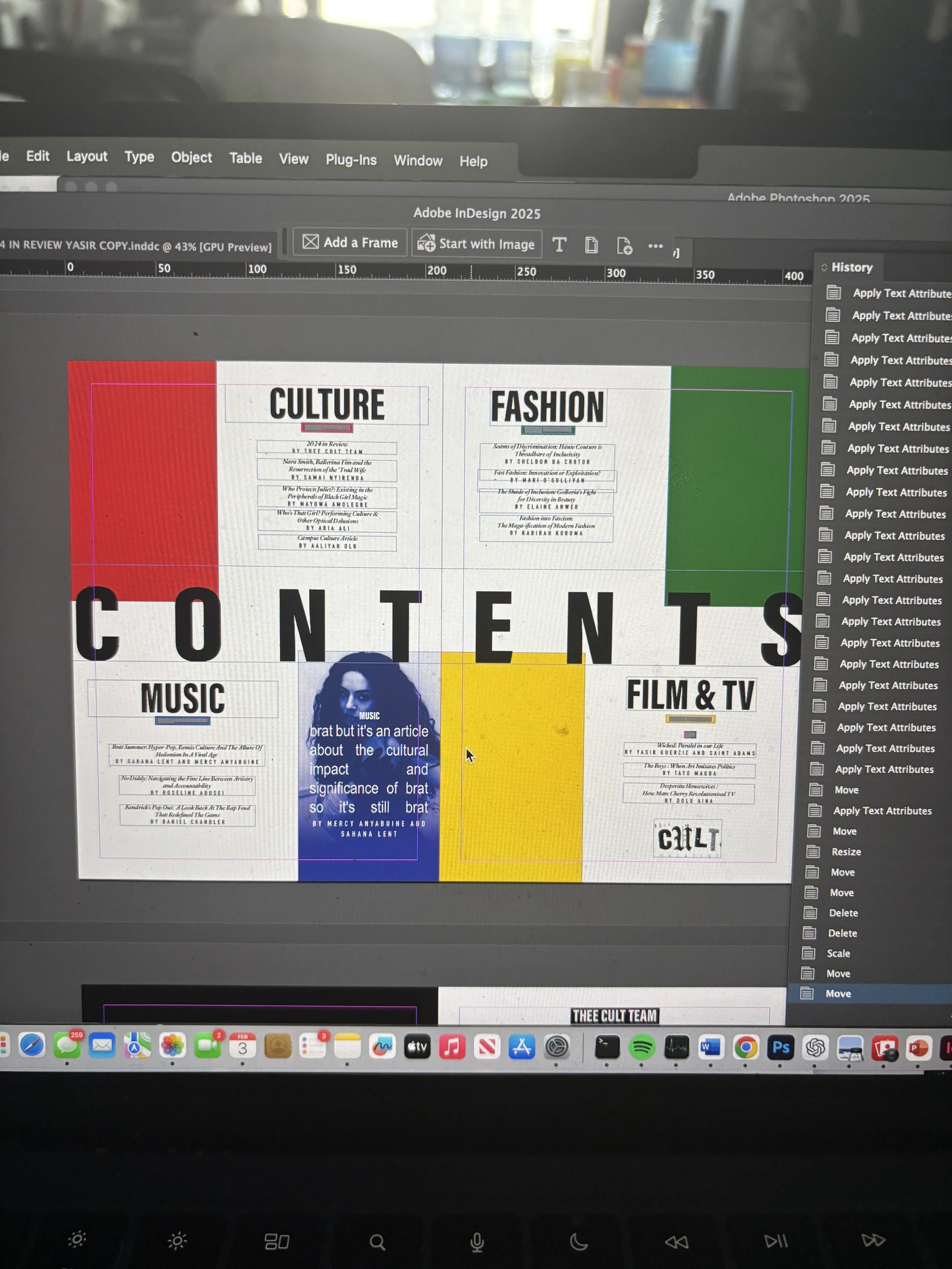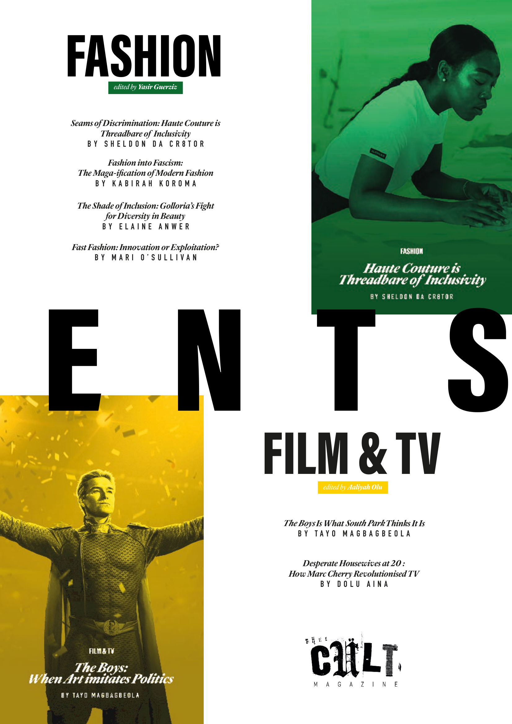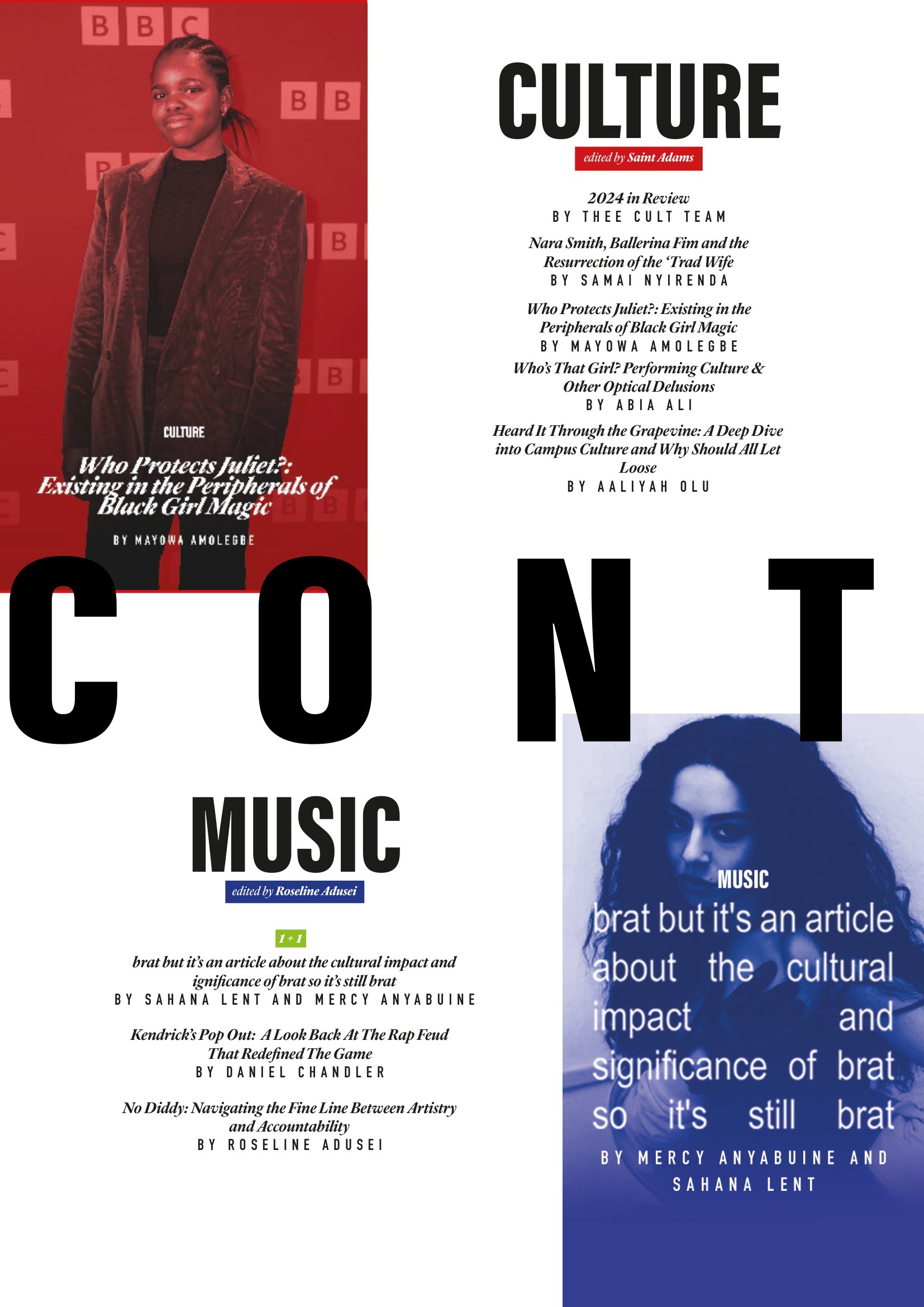 For Issue 3 of Thee Cult Magazine, I led the project as Editor-in-Chief and Creative Director, overseeing the publication’s structural redesign, editorial refinement, visual identity evolution and full-scale production. This issue marked the transition from experimental student magazine to a deliberately structured editorial platform, with formalised sections, a defined cover feature and a strengthened internal review process. My role spanned commissioning and editing writers, redesigning the logo, directing photography and executing the complete layout in InDesign. Issue 3 represents the consolidation of creative ambition into systems - transforming Thee Cult from a growing project into a disciplined publication.Issue 3 marked a defining shift for Thee Cult Magazine, as it established a distinct identity separate from Pop Cult and formalised the publication as a scalable editorial platform. Built around a "2024 in Review" theme - a revisited failed concept from 2024's The Contributors' Issue - the issue focused on refining both visual identity and internal structure. Central to this shift was a redesign of the magazine’s visual language, beginning with the logo. Rather than abandoning the scrapbook aesthetic established in earlier issues, we simplified and abstracted it into a more controlled, adaptable form.This shift was directly tied to the decision to launch a dedicated social media presence for Thee Cult. Previously, the magazine had been promoted through the Warwick Pop Cult account, but Issue 3 marked the point at which it began to operate as a distinct entity with its own platform and visual identity. The redesigned logo and simplified system allowed the brand to translate effectively across this new context, supporting a more cohesive and recognisable rollout.As Editor-in-Chief and Creative Director, I oversaw the expansion of the magazine’s sectional structure across culture, music, fashion, and film & TV, managing section editors while also operating directly as Culture Editor. I led the development of editorial direction by defining pitch briefs, often building them into fully realised concepts before guiding contributors through a structured editorial process that included written feedback and, where possible, live editing sessions.Alongside the development of a distinct visual identity, Issue 3 was supported by a more intentional social media rollout, which functioned not only as a promotional tool but as part of the magazine’s editorial workflow. With the launch of a dedicated Thee Cult platform, social media became a primary space for communicating briefs, promoting calls for submissions, and maintaining momentum across the production cycle.The assets, designed in Adobe Photoshop, were built to align with the updated visual system - balancing consistency with enough flexibility to accommodate different types of content, from contributor call-outs to feature highlights and section-specific posts. These visuals were used to guide contributors through the process, reinforce deadlines, and establish a recognisable presence as the magazine expanded beyond its original context within Warwick Pop Cult.A major development in Issue 3 was the transition into Adobe InDesign, marking a shift toward more professionalised layout and production processes. Alongside Yasir Guerziz, I began learning InDesign from scratch in the months leading up to the issue (October - December 2025), translating our existing Photoshop-based approach into the more structured editorial workflow of InDesign. This period was not only about learning a new software, but about understanding how InDesign could support the construction of a scalable design system. While writing was still being commissioned and developed, we used this time to experiment with layouts, master pages, and typographic structures - establishing a foundation that could later be adapted once final content was delivered. Through working in InDesign, we defined core elements of the magazine’s visual identity, including a clear typographic hierarchy, consistent grid systems, and a simplified approach to section-based design. These decisions allowed the magazine to move toward a more cohesive and recognisable visual language, while still retaining flexibility across different articles and formats.Importantly, this phase also strengthened our confidence as designers. By building and applying these systems directly within InDesign across both editorial and promotional outputs, the visual language of Thee Cult became something we could actively operate within - akin to becoming fluent in a language. This shift extended beyond layout into creative direction more broadly. Establishing a consistent visual language allowed for greater control over how the magazine was perceived and experienced across every touchpoint, from page design to social media and aesthetic tone. As Creative Director, this meant moving from making individual design decisions to shaping a cohesive world - where typography, layout, imagery and tone all worked together to support a unified editorial identity. Through this process, design became a framework for decision making across the publication. Rather than responding to content on a case-by-case basis, the established system provided clarity on how different elements should be treated, allowing the magazine to operate with greater intention, consistency and authority.
