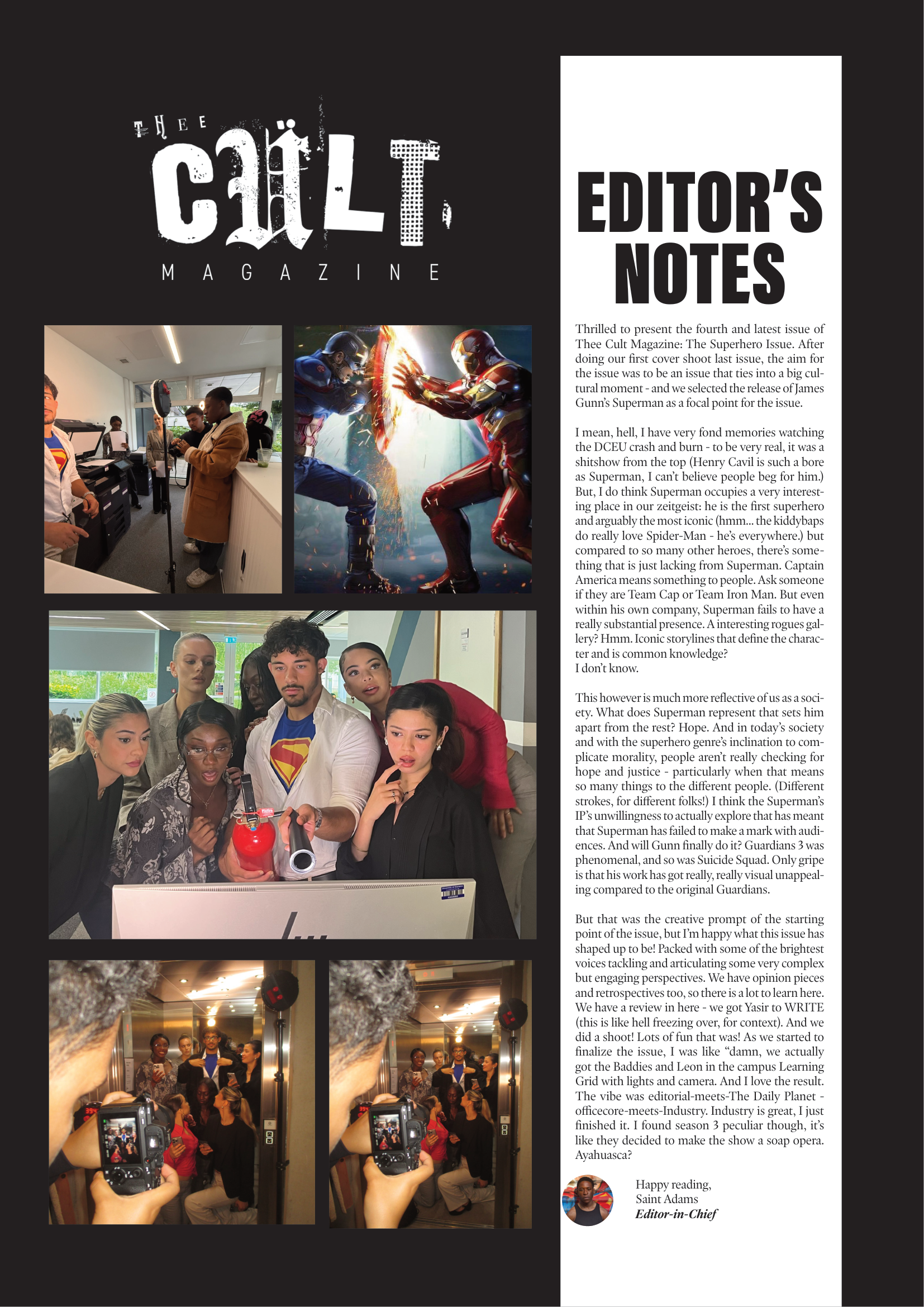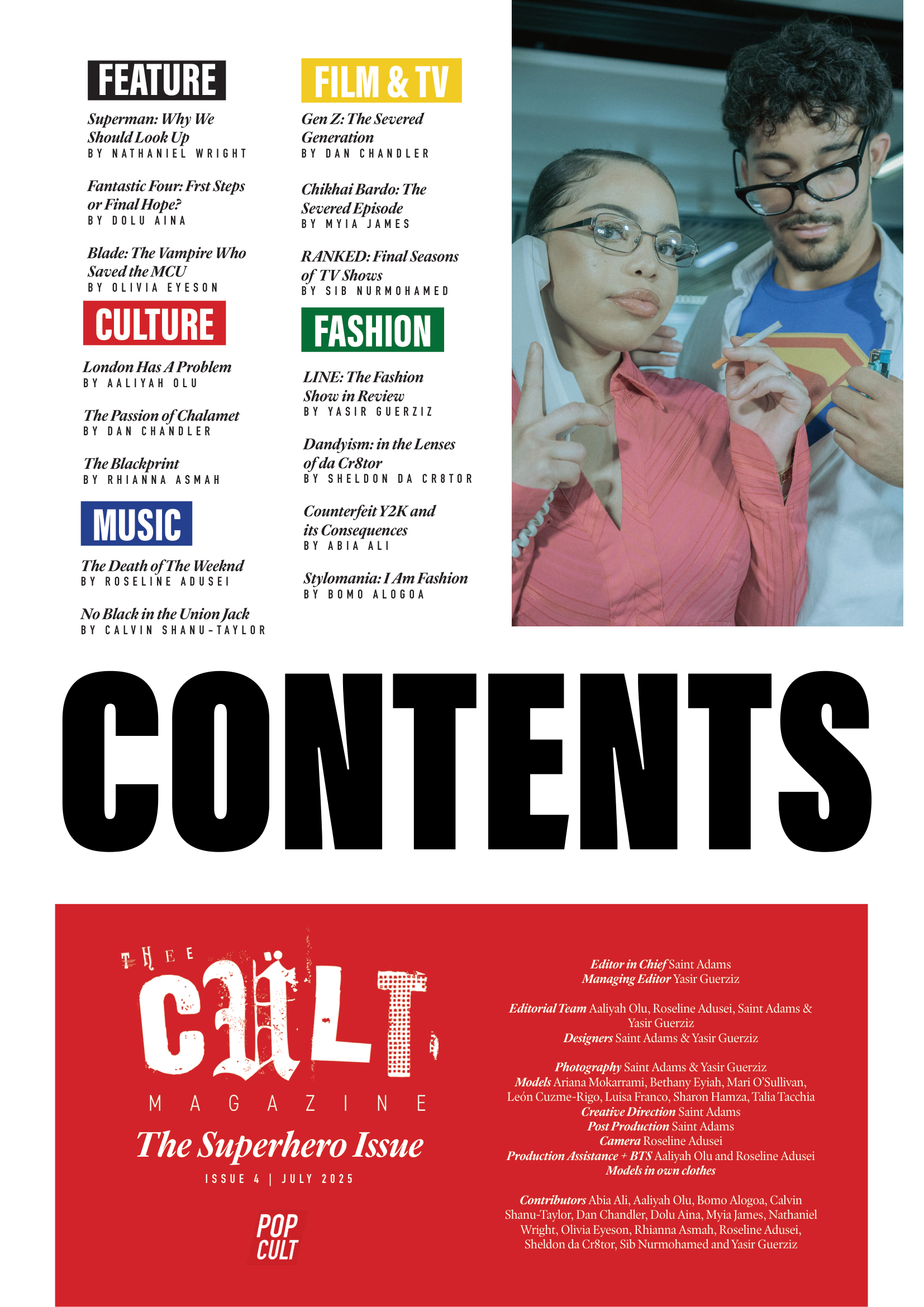For Issue 4 of Thee Cult Magazine, I led the project as Editor-in-Chief and Creative Director, overseeing the publication’s full editorial, operational and distribution process. This issue marked a shift from establishing structure to enforcing it, with a clear emphasis on workflow, discipline and consistency across all stages of production. My role spanned managing all commissioned writing, directing contributors through deadlines and revisions, overseeing social media rollout, and maintaining editorial coherence across the issue. All content and design decisions were guided through a centralised process, ensuring consistency from development through to final output.